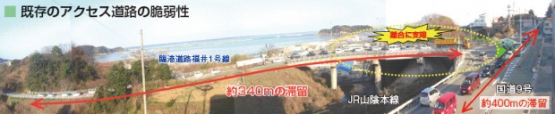 浜田港で外貿貨物等を取り扱う主要なふ頭のある福井地区と背後を結ぶ既存の臨港道路福井1号線は、接続する幹線道路の渋滞や急勾配による大型貨物車両の速度低下等により、増加が見込まれる円滑な貨物輸送に支障となっています。