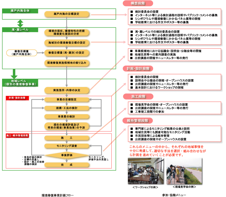 本計画では、環境修復を高める際の計画段階から、設計・施工及び事後の評価に至るまでの一連の手順を包括した 標準的な計画手法の提案を行いました。