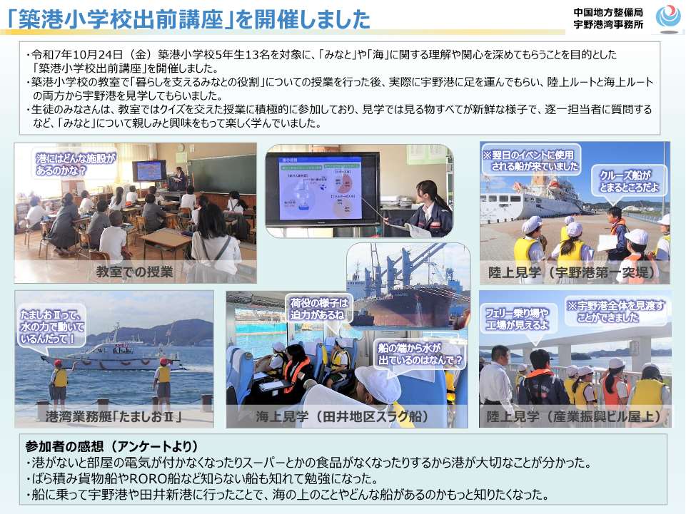 「築港小学校出前講座」を開催しました 令和7年10月24日(金)築港小学校5年生13名を対象に、 「みなと」や「海」に関する理解や関心を深めてもらうことを目的とした「築港小学校出前講座」を開催しました。 当事務所での築港小学校との出前講座は初の開催であり、築港小学校の教室で授業を行った後、 陸上ルートと海上ルートの両方から宇野港を見学してもらいました。 ※詳細については以下の資料をご覧ください。 (クリックしていただきますとPDFが開きます。)